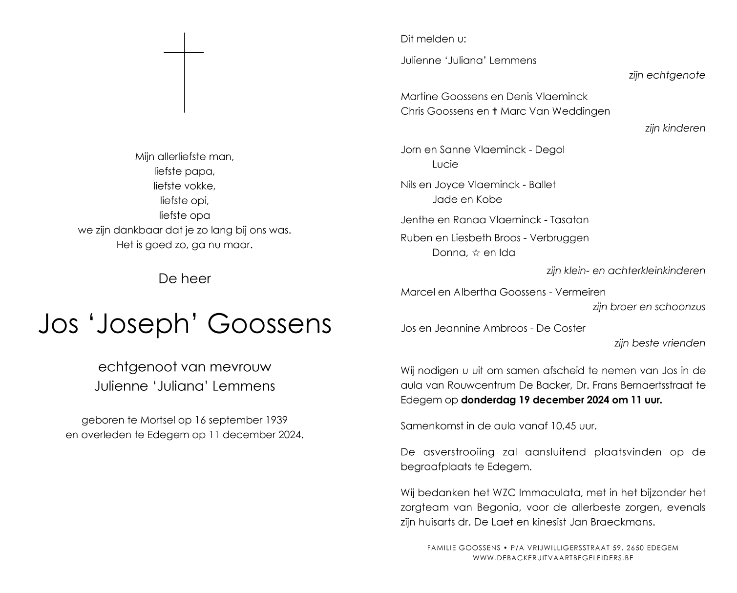 Overleden te Edegem (2650) op woensdag 11 december 2024 op 85-jarige leeftijd