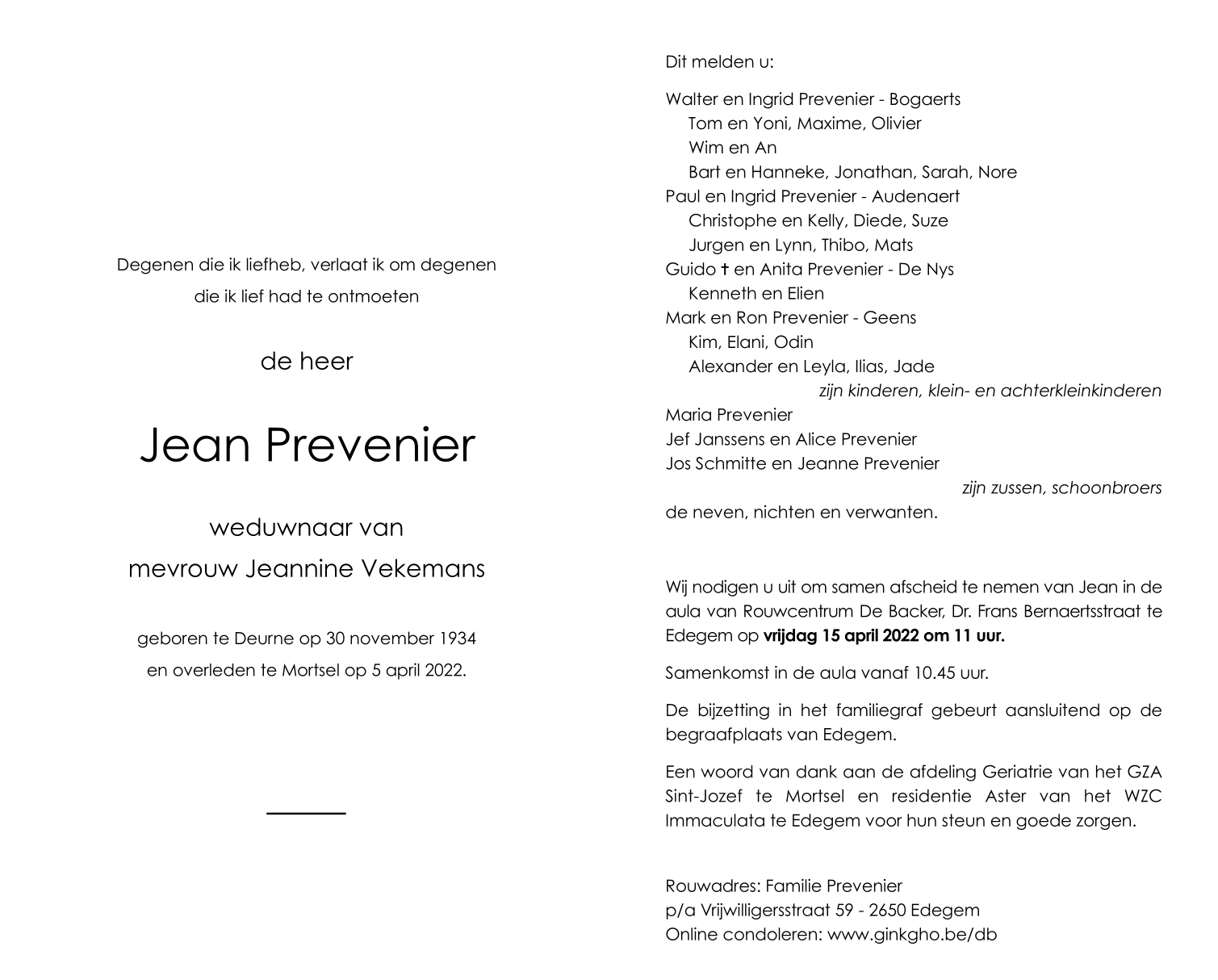 Overlijdensbericht Jean Prevenier