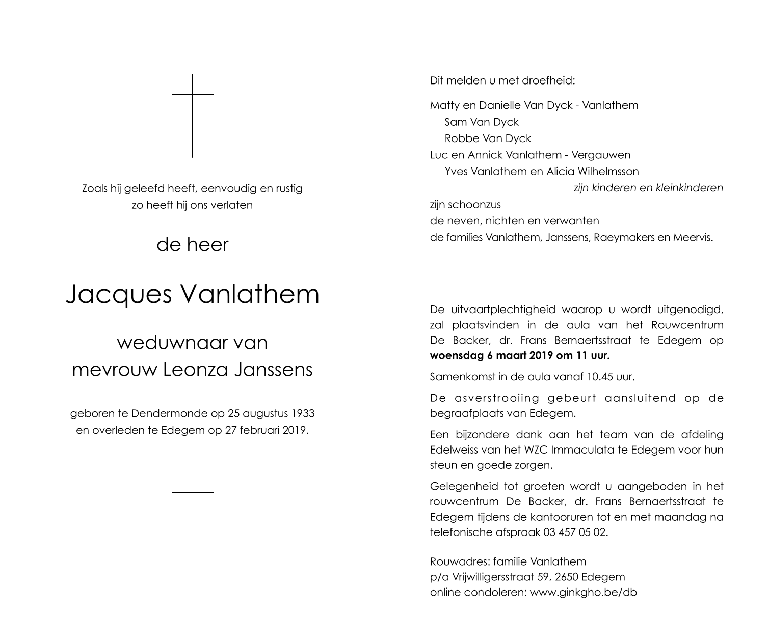 Overleden te Edegem (2650) op woensdag 27 februari 2019 op 85-jarige leeftijd