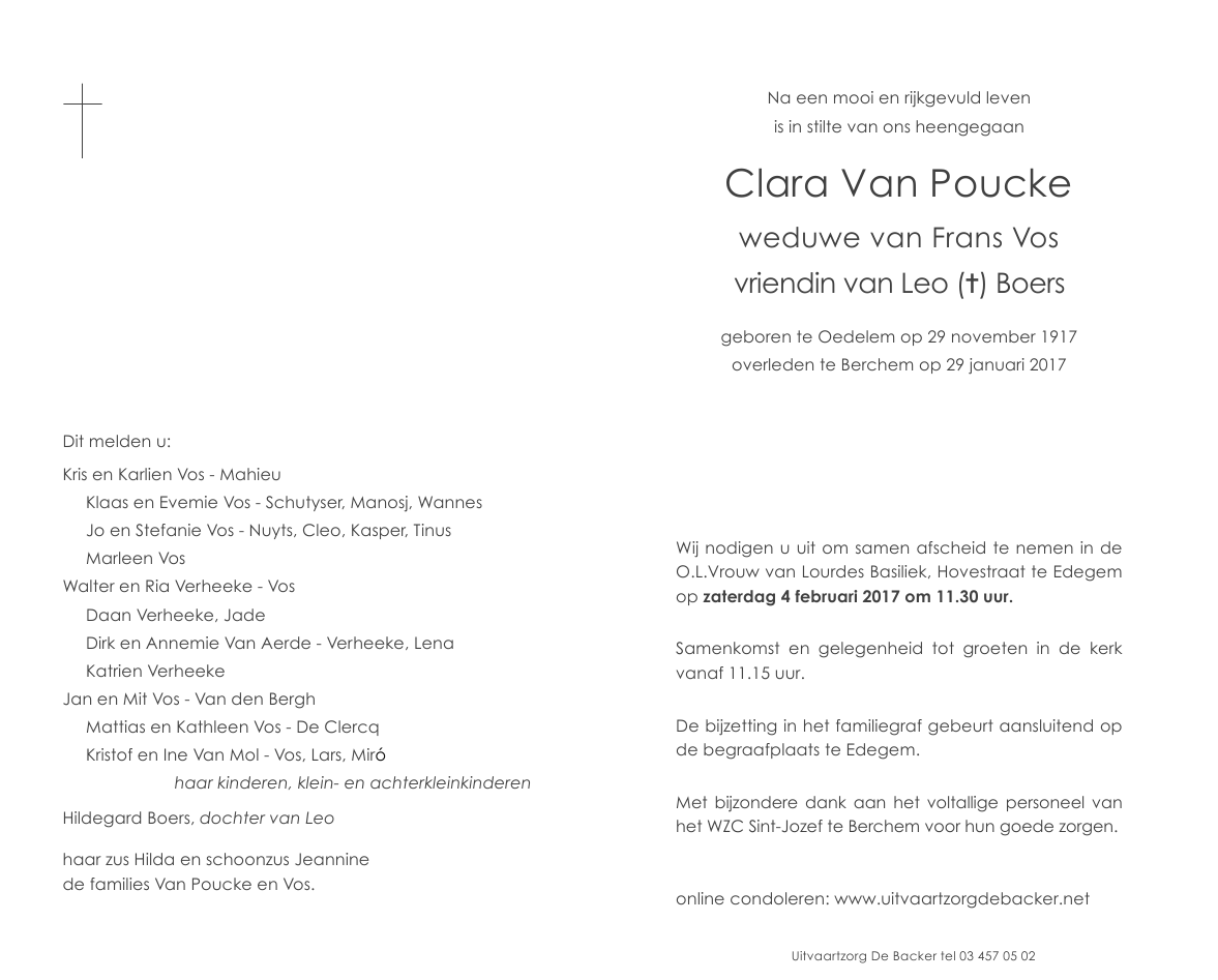 Overleden te Berchem (Antwerpen) (2600) op zondag 29 januari 2017 op 99-jarige leeftijd